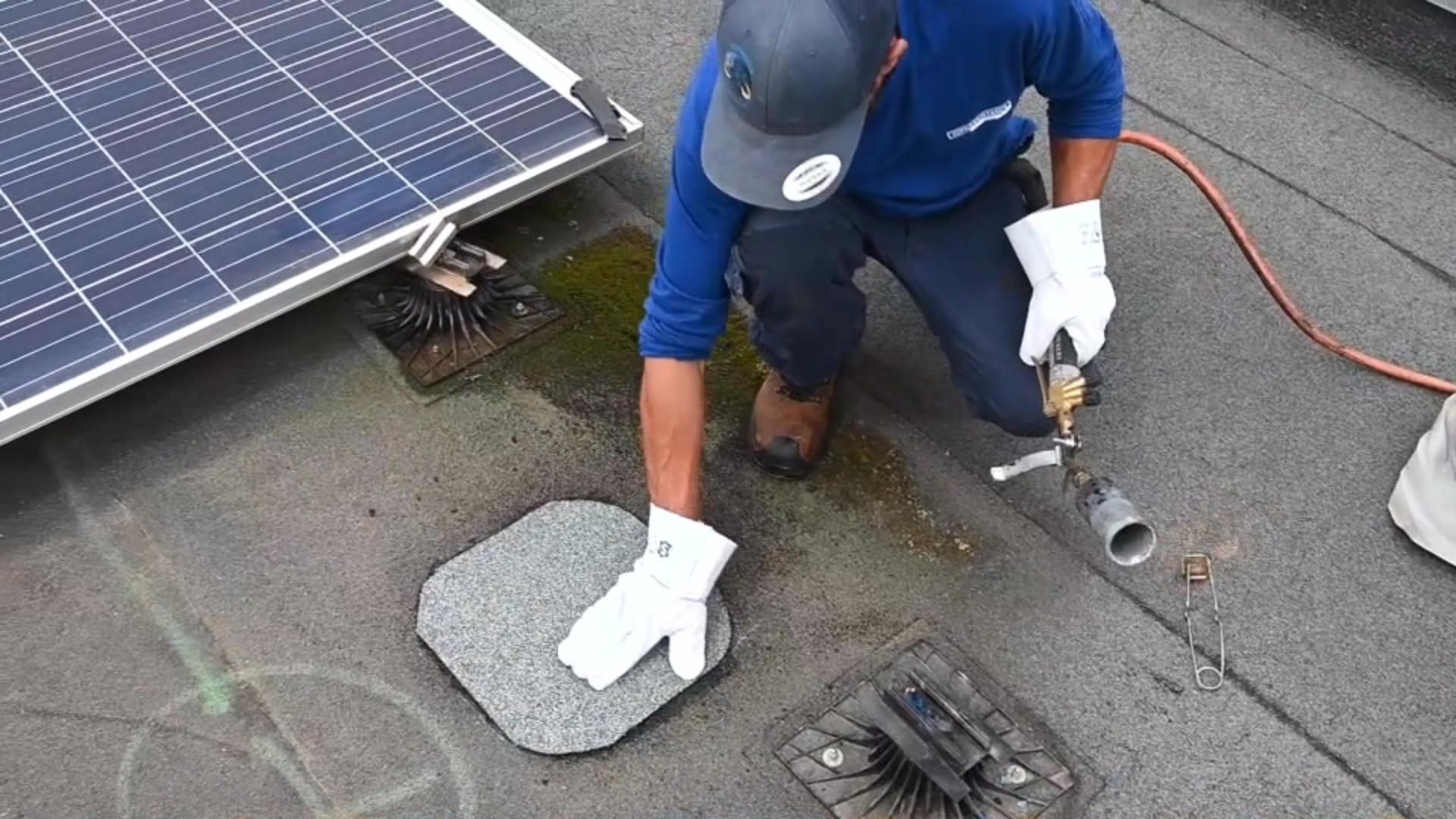 Nous nettoyons sous les panneaux, contrôlons le système d’étanchéité, éliminons débris et feuilles mortes puis remettons les panneaux en place après réparation.