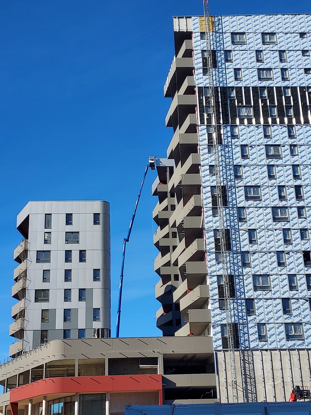 L’intervention SOPREMA Entreprises a porté sur la réalisation de 5 000 m² de bardage rapporté, avec la mise en œuvre d’une ossature réglable, d’une isolation en laine de verre de 120 mm et de panneaux composites Larson A2.