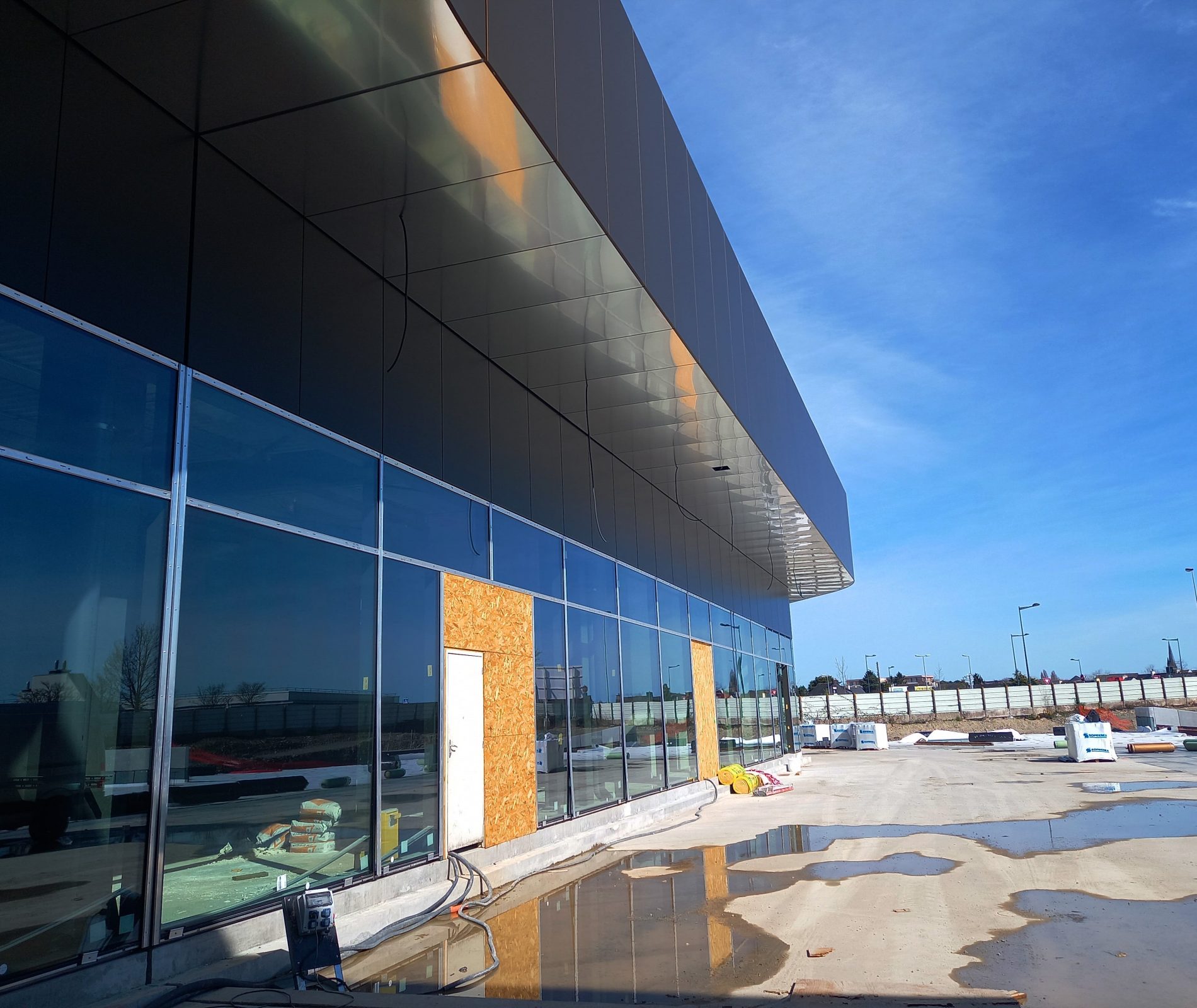 Composé de deux bâtiments, séparés d’une verrière, le nouveau centre commercial de Chantepie est en cours de construction. L’ouvrage sera coiffé d’une toiture solaire.
