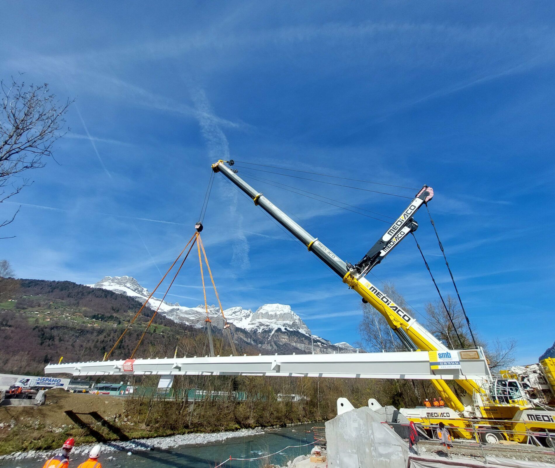 La passerelle haubanée de 55 mètres a été fabriquée par tronçons dans les ateliers bretons de SMB Constructions Métalliques avant d’être assemblée sur site. Une fois l’ossature métallique du tablier en place, un imposant pylône de 18 mètres a été érigé, suivi du montage des haubans.