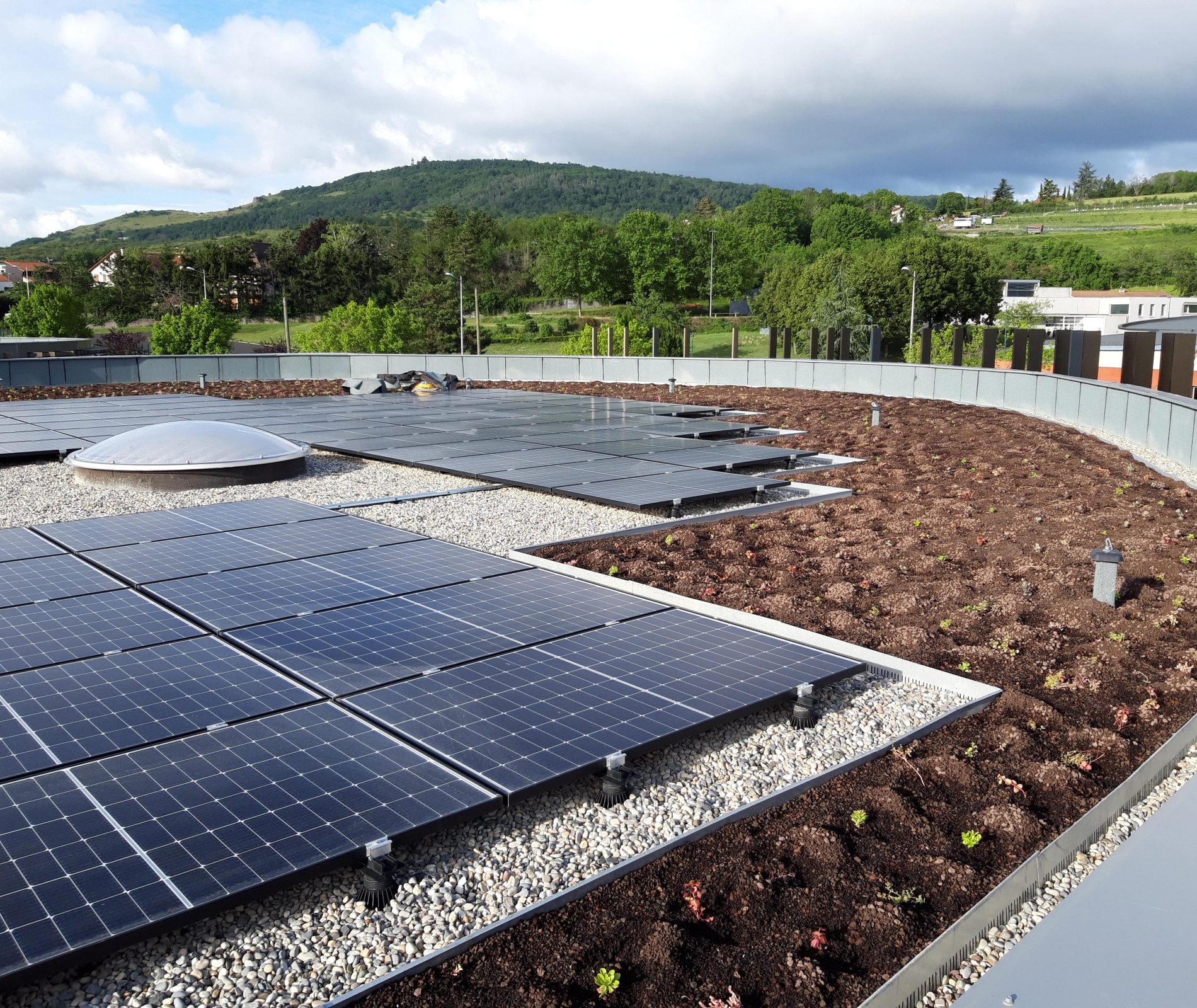 En toiture, le complexe photovoltaïque est entouré d’une protection rapportée en gravillons blancs, puis d’un large tapis végétal de 1 000 m2 de la solution SOPRANATURE® Toundra.